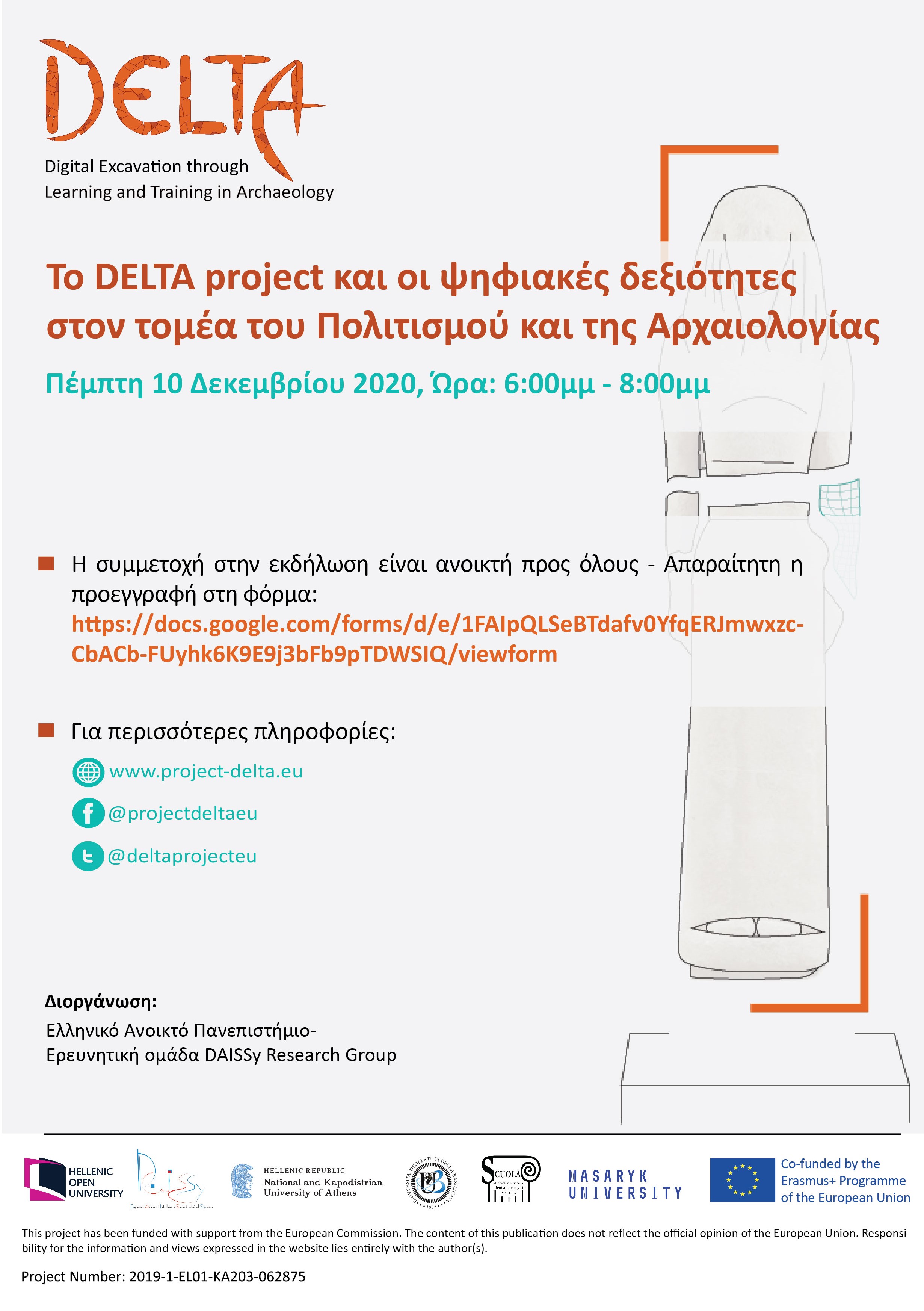 Η ερευνητική ομάδα DAISSy του Ελληνικού Ανοικτού Πανεπιστημίου σας προσκαλεί στην πρώτη διαδικτυακή εκδήλωση που διοργανώνει στο πλαίσιο το Ευρωπαϊκού έργου «DELTA – Digital Excavation through Learning and Training in Archaeology». Η εκδήλωση θα λάβει χώρα την Πέμπτη 10 Δεκεμβρίου 2020 από τις 18:00 έως τις 20:00 διαδικτυακά, μέσω της πλατφόρμας MS Teams. Στην εκδήλωση συμμετέχει το Τμήμα της Ιστορίας και Αρχαιολογίας του Εθνικού και Καποδιστριακού Πανεπιστημίου Αθηνών, εταίρος του DELTA.