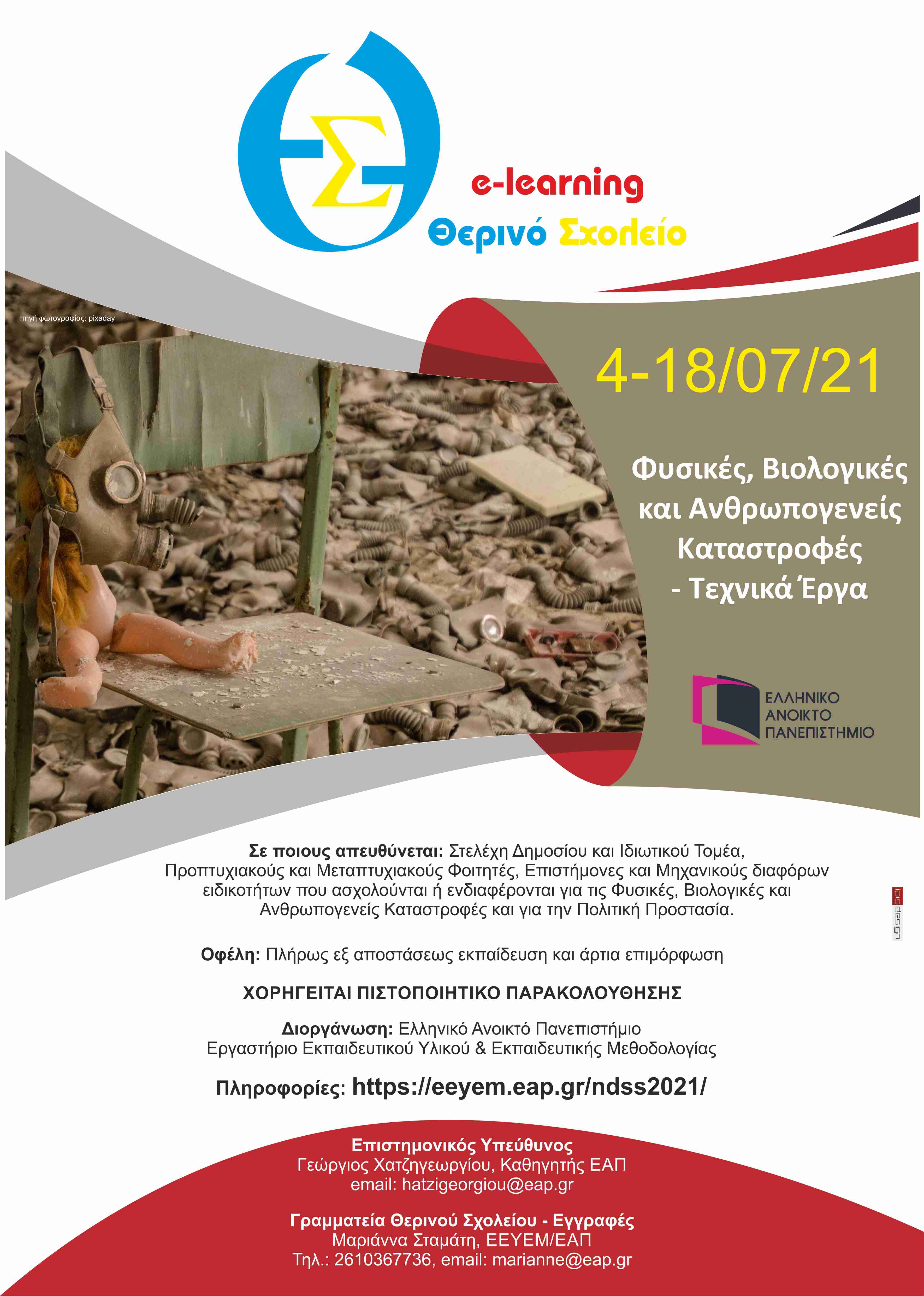Το Ελληνικό Ανοικτό Πανεπιστήμιο σε συνεργασία με το Εργαστήριο Εκπαιδευτικού Υλικού και Εκπαιδευτικής Μεθοδολογίας (ΕΕΥΕΜ/ΕΑΠ) και με Επιστημονικό Υπεύθυνο τον Καθηγητή ΣΘΕΤ/ΕΑΠ Γεώργιο Χατζηγεωργίου διοργανώνουν e-learning Θερινό Σχολείο με θέμα “Φυσικές και ανθρωπογενείς καταστροφές και τεχνικά έργα” (NDSS2021)