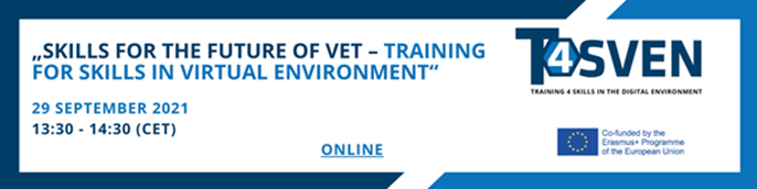 Η ερευνητική ομάδα DAISSy του Ελληνικού Ανοικτού Πανεπιστημίου διεξήγαγε στις 29 Σεπτεμβρίου 2021 διαδικτυακή εκδήλωση με θέμα «Βήμα στο Μέλλον – Κατάρτιση για Δεξιότητες σε Εικονικό Περιβάλλον». Η συνάντηση έλαβε χώρα στο πλαίσιο του Ευρωπαϊκού έργου “T4SVEN: Training 4 Skills in the Digital Environment”, το οποίο χρηματοδοτείται από το πρόγραμμα Erasmus+ Key Activity 2: Partnerships for Digital Education Readiness in Vocational Education and Training. Συντονιστής φορέας του έργου είναι ο Οργανισμός Επαγγελματικής Εκπαίδευσης και Εκπαίδευσης Ενηλίκων της Κροατίας και εταίροι είναι το Πανεπιστήμιο Πατρών (Ελλάδα), το δίκτυο φορέων Επαγγελματικής Εκπαίδευσης και Κατάρτισης EVBB (Βέλγιο), το Πανεπιστήμιο Κύπρου (Κύπρος) και το Ελληνικό Ανοικτό Πανεπιστήμιο (Ελλάδα), το οποίο εκπροσωπεί η ερευνητική ομάδα DAISSy.