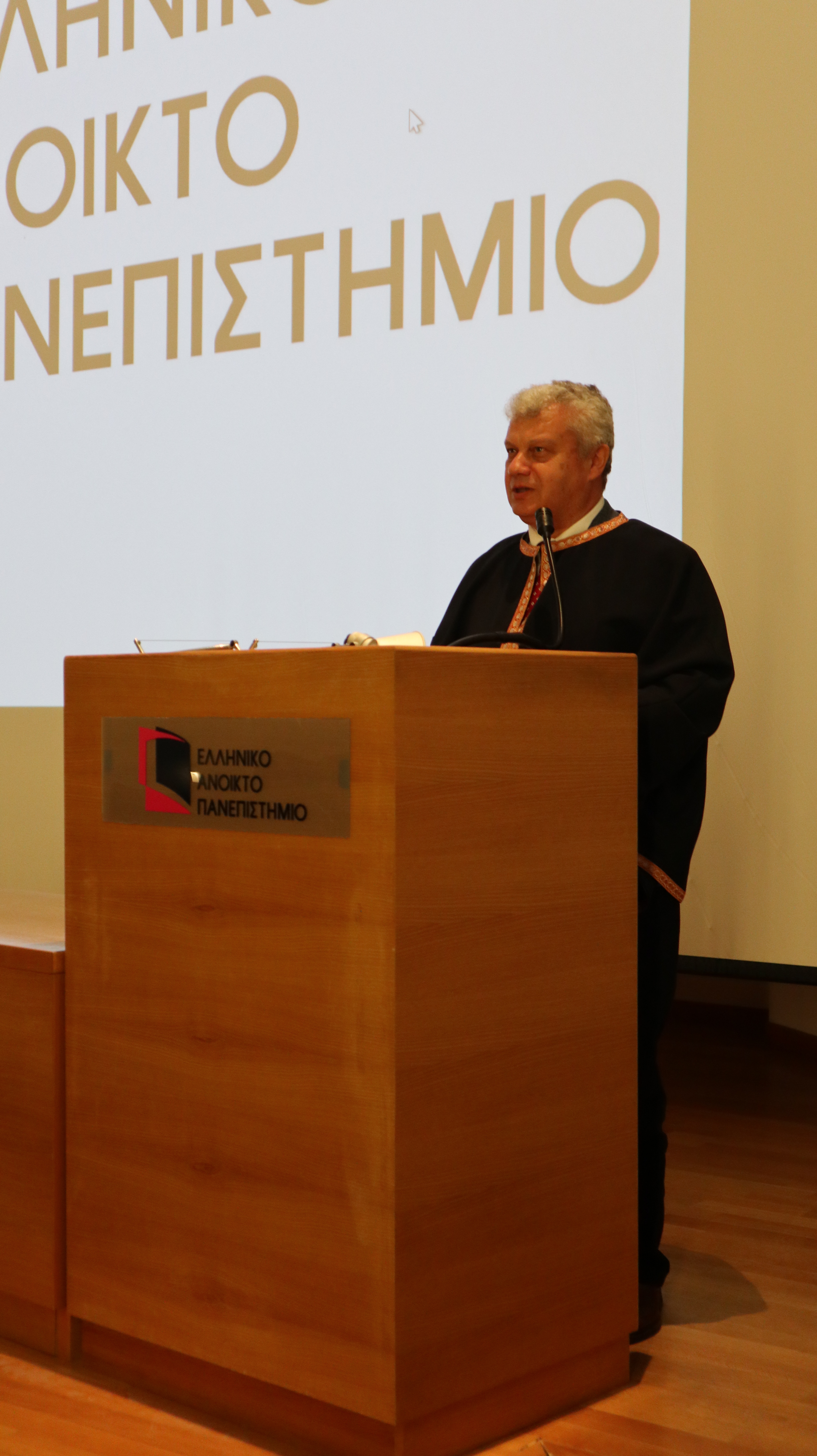 Την έναρξη των τελετών πραγματοποίησε ο Πρόεδρος της Δ.Ε. του Ε.Α.Π. Καθηγητής Οδυσσέας – Ιωάννης Ζώρας δηλώνοντας πως το Ε.Α.Π. είναι ένα συνεχώς αναπτυσσόμενο Πανεπιστήμιο με ακαδημαϊκή, διοικητική και ερευνητική ευχέρεια και εξελίσσεται με γρήγορους ρυθμούς καταφέρνοντας όχι μόνο να ανταποκρίνεται συνεχώς στις αυξανόμενες απαιτήσεις της σύγχρονης αγοράς, αλλά να προηγείται κιόλας. Το ΕΑΠ διατηρεί πάντα το έντονο κοινωνικό του προφίλ μέσω χορήγησης υποτροφιών και απαλλαγής οικονομικής συμμετοχής σε ευάλωτες ομάδες, όπως την πρόσφατη περίπτωση των Ουκρανών φοιτητών.