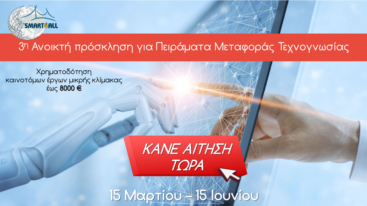 Ε.Α.Π. > Ανακοινώσεις > Τρέχουσες > 3η Ανοικτή πρόσκληση για Πειράματα Μεταφοράς Τεχνογνωσίας – Knowledge Transfer Experiments (KTE) από το SMART4ALL