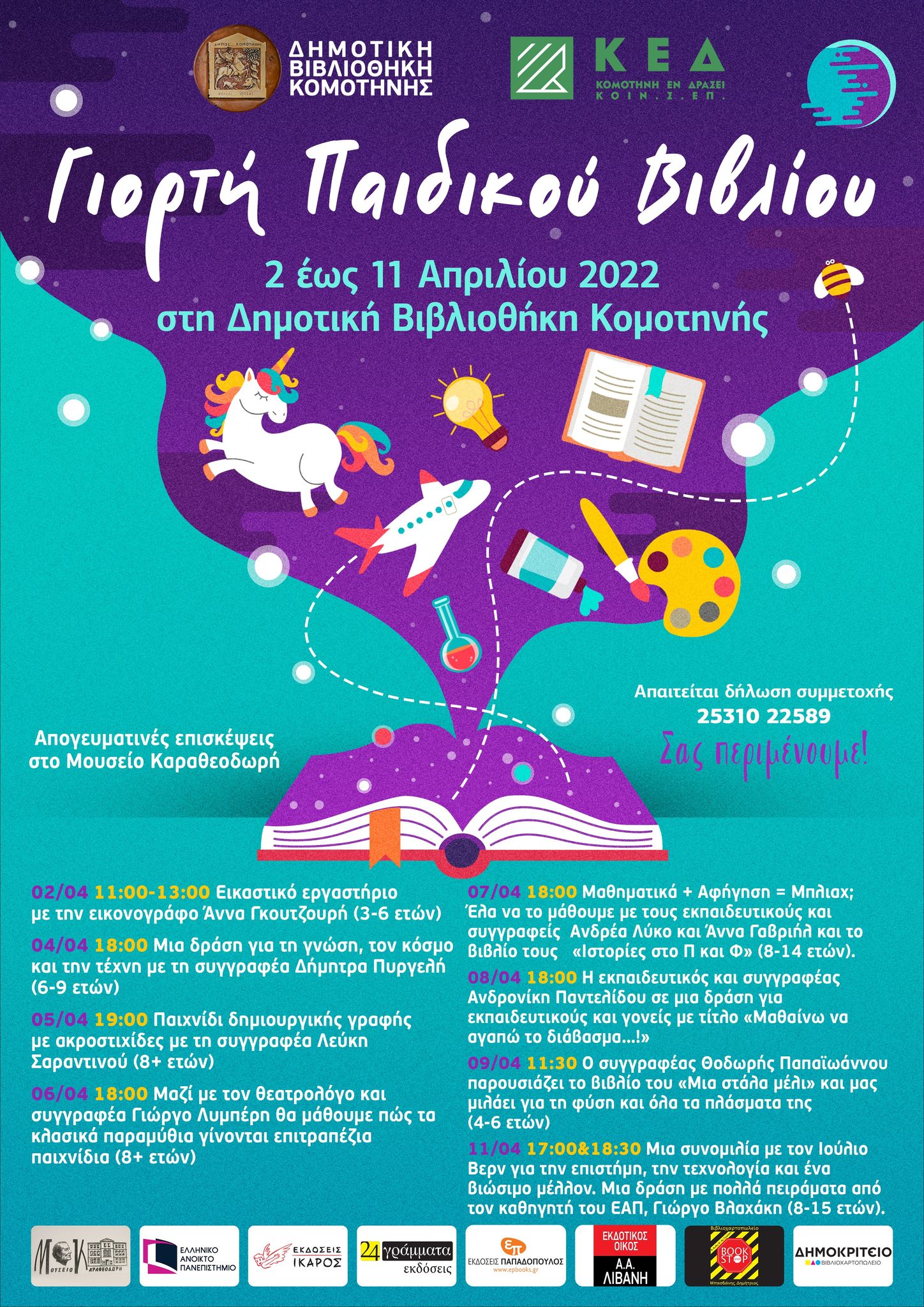 Με αφορμή την Παγκόσμια Ημέρα Παιδικού Βιβλίου και στο πλαίσιο των εκδηλώσεών της Δημοτικής Βιβλιοθήκης Κομοτηνής το Παράρτημα του ΕΑΠ στην Κομοτηνή υλοποιεί, την Δευτέρα, 11/04/2022, στις 17:00 & 19:30 (παιδιά ηλικίας 8 έως 15 ετών) εκδήλωση με τίτλο «Από τη Γη στη Σελήνη και από τις κορυφές των πιο ψηλών βουνών στα βάθη των ωκεανών. Μια συνομιλία με τον Ιούλιο Βερν για την επιστήμη, την τεχνολογία και ένα βιώσιμο μέλλον για την ανθρωπότητα.» Μια δράση με πολλά πειράματα από τον Αν. Καθηγητή του Ελληνικού Ανοικτού Πανεπιστημίου, Γιώργο Βλαχάκη.