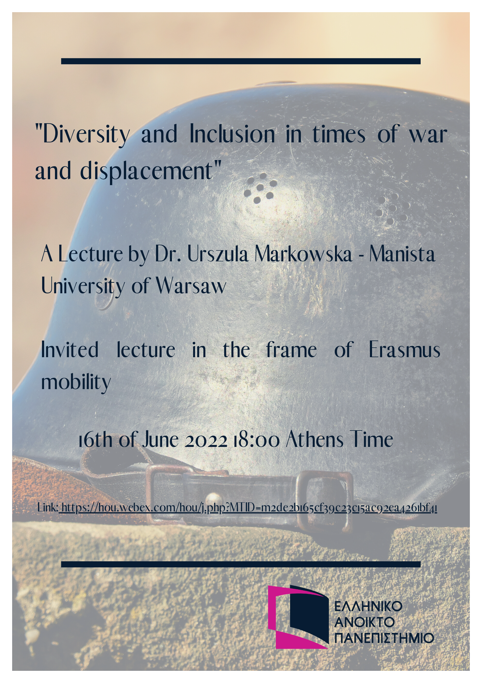 Το Ελληνικό Ανοικτό Πανεπιστήμιο και το Μεταπτυχιακό Πρόγραμμα Σπουδών «Γλωσσική Εκπαίδευση για Πρόσφυγες και Μετανάστες (L.R.M.)» σας προσκαλούν στην ομιλία της Καθηγήτριας κ. Urszula Markowska-Manista από το Πανεπιστήμιο της Βαρσοβίας, με τίτλο «Diversity and Inclusion in times of war and displacement»