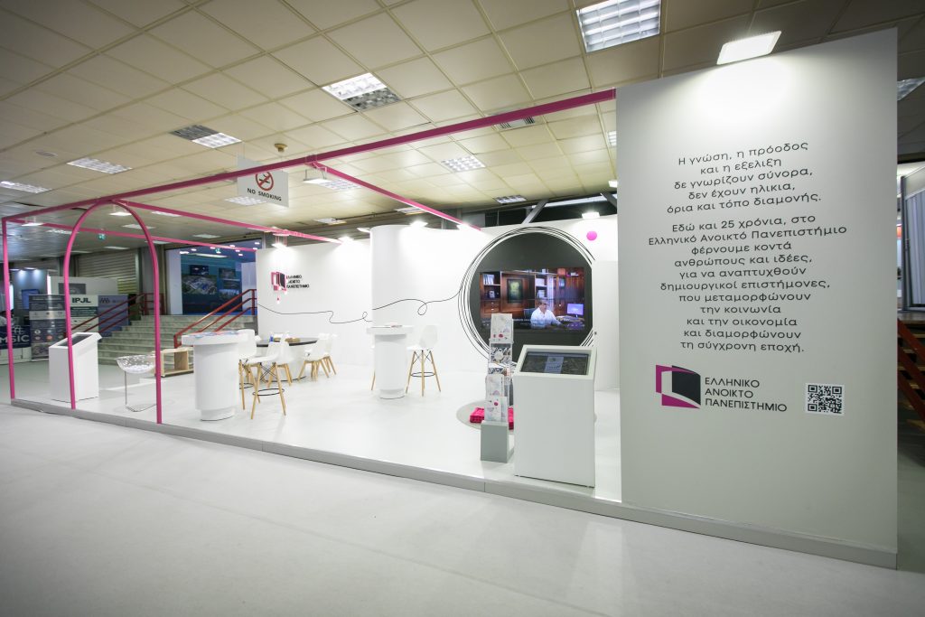 Σε έναν ειδικά, σημειολογικά, σχεδιασμένο «Ανοικτό» χώρο, οι επισκέπτες μπόρεσαν να περιηγηθούν «διαδραστικά» στους «”ανοικτούς” ηλεκτρονικούς χώρους εκπαίδευσης του ΕΑΠ» και να βιώσουν την εμπειρία της προσφοράς εκπαίδευσης και Παιδείας με τη χρήση και τη βοήθεια της εικονικής πραγματικότητας, αλλά και να ενημερωθούν, μεταξύ άλλων, για τα συνολικά 16 νέα καινοτόμα Προγράμματα Μεταπτυχιακών και Προπτυχιακών Σπουδών που έχει δημιουργήσει και προσφέρει το ΕΑΠ την τελευταία διετία.