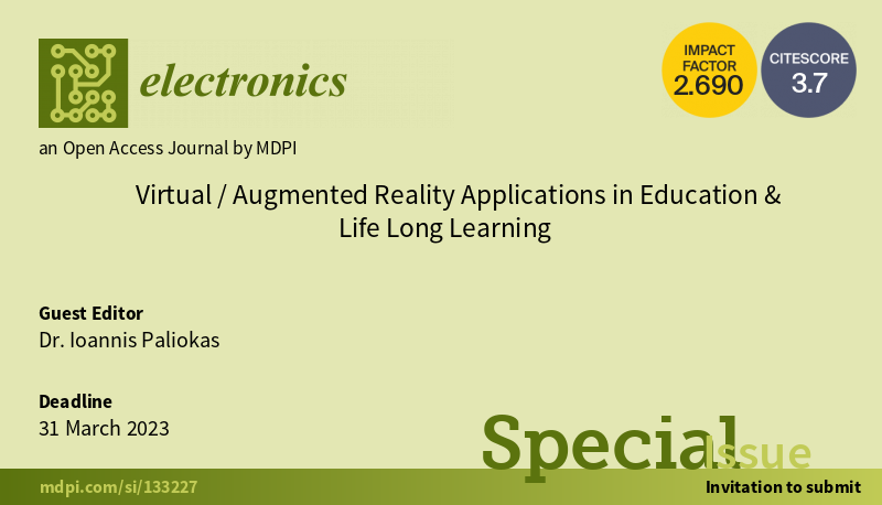 The Special Issue “Virtual/Augmented Reality Applications in Education & Life Long Learning” is now open for submission (Deadline: 31 March 2023). Original research and reviews which cover technological, sociological and pedagogical aspects of the Virtual/Augmented Reality technology in education are welcomed. For more details, please visit: https://www.mdpi.com/journal/electronics/special_issues/2YZN39ZHEL