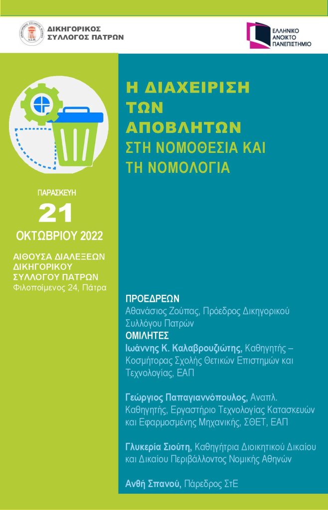 ΠΡΟΣΚΛΗΣΗ ΣΕ ΗΜΕΡΙΔΑ ΔΣΠ: Η ΔΙΑΧΕΙΡΙΣΗ ΤΩΝ ΑΠΟΒΛΗΤΩΝ ΣΤΗ ΝΟΜΟΘΕΣΙΑ ΚΑΙ ΤΗ ΝΟΜΟΛΟΓΙΑ, ΠΑΤΡΑ 21/10/2022, ΩΡΑ 19.00