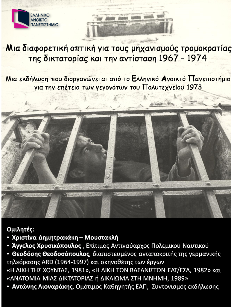Το Ελληνικό Ανοικτό Πανεπιστήμιο έχει την τιμή να σας καλέσει στην εκδήλωση που θα διεξαχθεί με θέμα «Μια διαφορετική οπτική για τους μηχανισμούς τρομοκρατίας της δικτατορίας και την αντίσταση 1967 – 1974» στο παράρτημά του την Παρασκευή 18 Νοεμβρίου 2022 και ώρα 6 μ.μ. στην Οδό Γραβιάς 4, πίσω από την Πλατεία Κάνιγγος στην Αθήνα.
