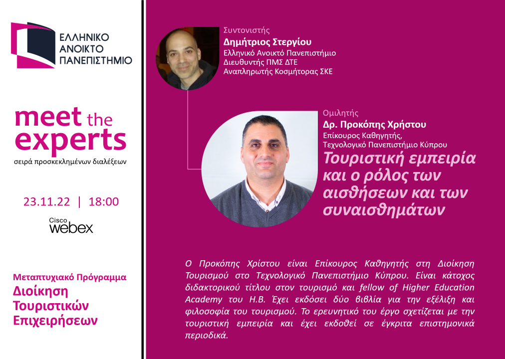 Το Μεταπτυχιακό Πρόγραμμα Σπουδών της Σχολής Κοινωνικών Επιστημών του Ελληνικού Ανοικτού Πανεπιστημίου, «Διοίκηση Τουριστικών Επιχειρήσεων (ΔΤΕ)», διοργανώνει την 1η διαδικτυακή εκδήλωση της σειράς προσκεκλημένων διαλέξεων “Meet theexperts” (ακ. έτος 2022-23), την Τετάρτη 23 Νοεμβρίου 2022 στις 18:00