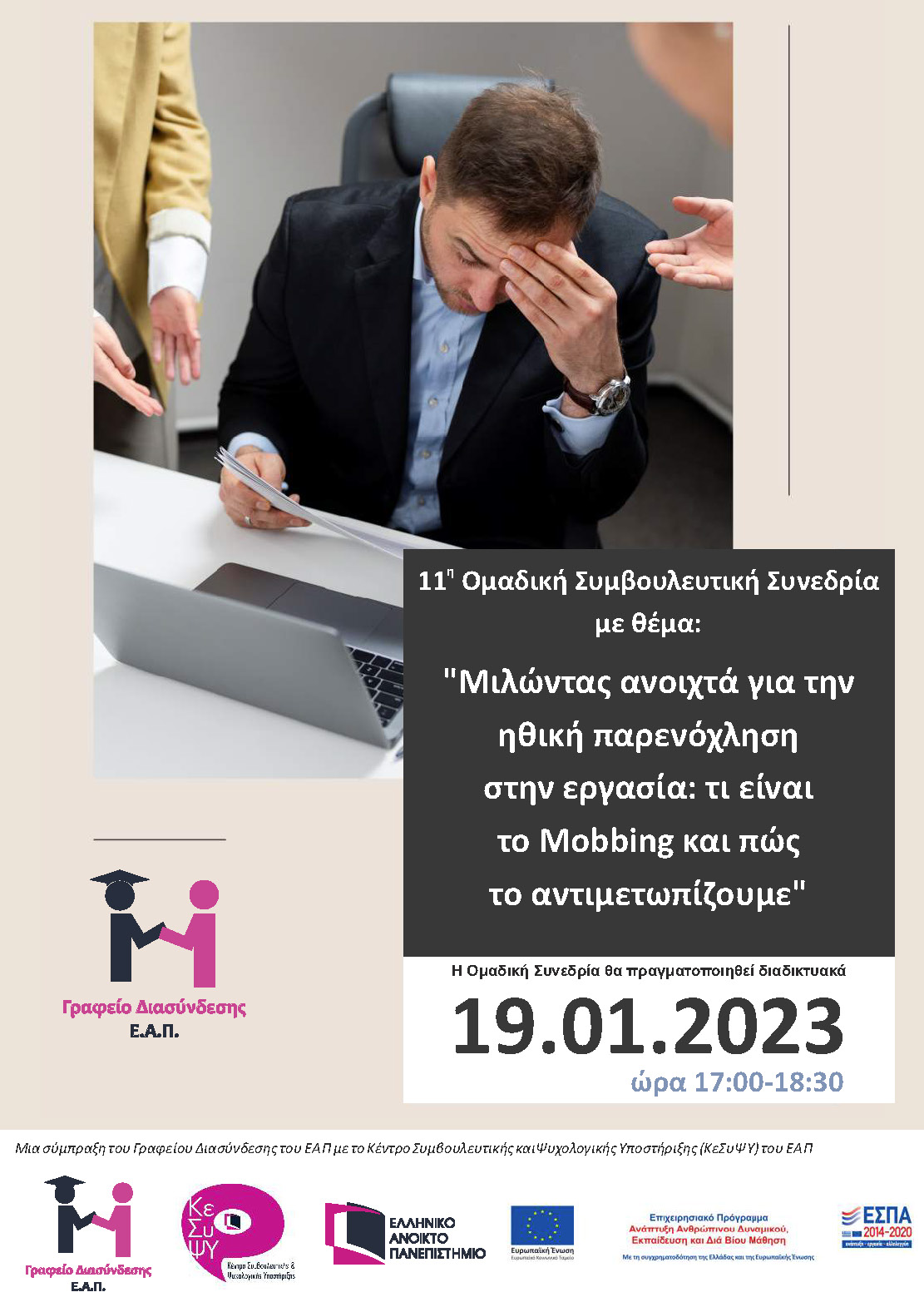 «Μιλώντας ανοιχτά για την ηθική παρενόχληση στην εργασία: τι είναι το Mobbing και πώς το αντιμετωπίζουμε», μια σύμπραξη του Γραφείου Διασύνδεσης του ΕΑΠ με το Κέντρο Συμβουλευτικής και Ψυχολογικής Υποστήριξης (ΚεΣυΨΥ) του ΕΑΠ.