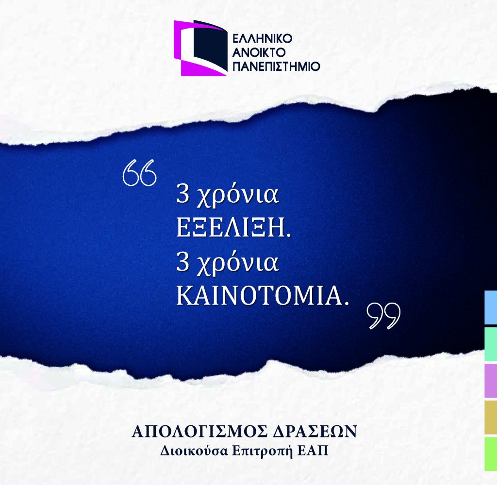 Το Ελληνικό Ανοικτό Πανεπιστήμιο παρουσιάζει τον απολογισμό της τριετίας Σεπτέμβριος 2019 έως Οκτώβρη 2022. Σε αυτή την τριετία η νέα Διοικούσα Επιτροπή έθεσε κάποιους στόχους :