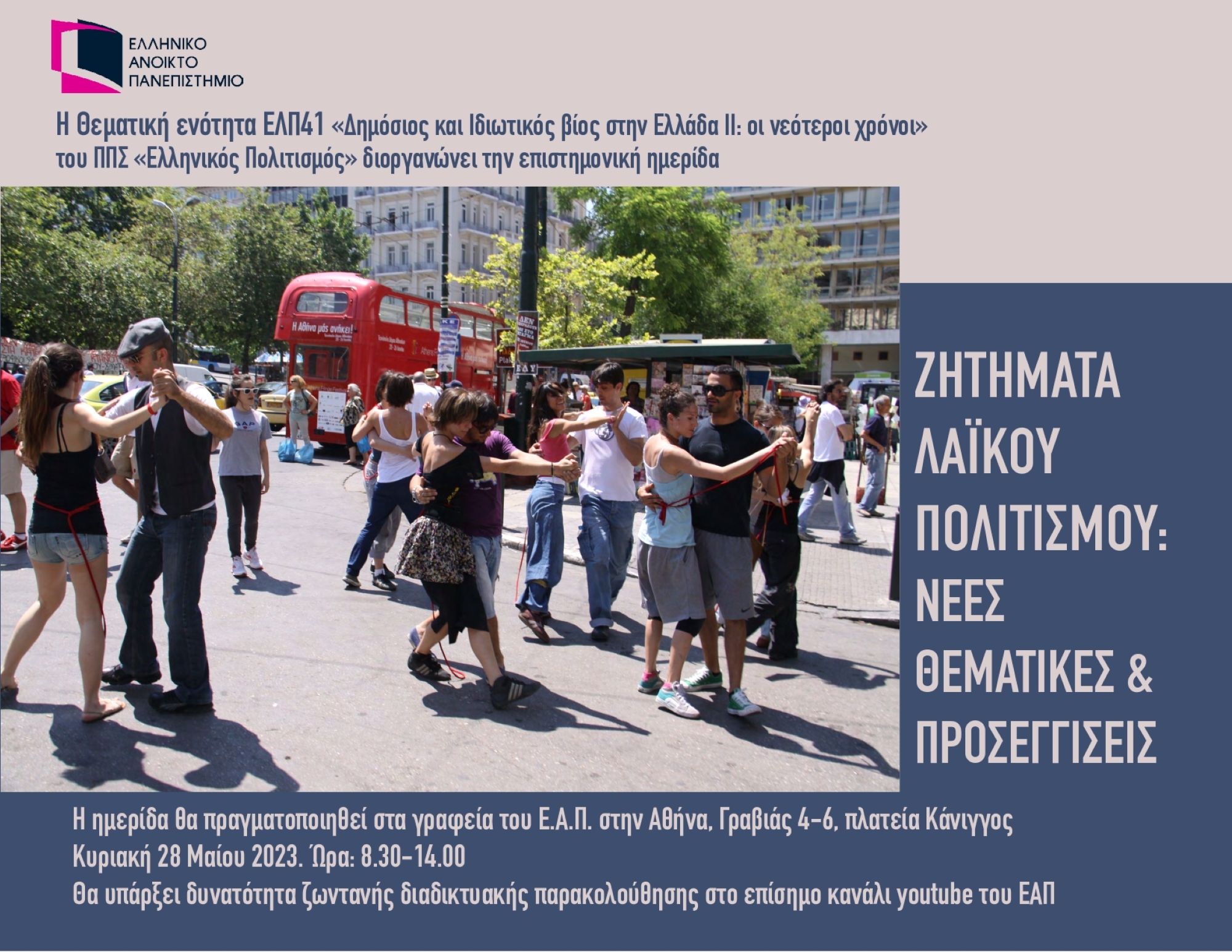 Η Σχολή Ανθρωπιστικών Επιστημών του Ελληνικού Ανοικτού Πανεπιστημίου, το Προπτυχιακό Πρόγραμμα «Σπουδές στον Ελληνικό Πολιτισμό» και η Θεματική Ενότητα: «ΔΗΜΟΣΙΟΣ & ΙΔΙΩΤΙΚΟΣ ΒΙΟΣ ΙΙ. ΝΕΟΤΕΡΟΙ ΧΡΟΝΟΙ» (ΕΛΠ 41), διοργανώνει τη 2η Επιστημονική Ημερίδα με τίτλο: « «ΖΗΤΗΜΑΤΑ ΛΑΙΚΟΥ ΠΟΛΙΤΙΣΜΟΥ. ΝΕΕΣ ΘΕΜΑΤΙΚΕΣ & ΠΡΟΣΕΓΓΙΣΕΙΣ». Η Επιστημονική Ημερίδα θα διεξαχθεί δια ζώσης στα γραφεία του Ανοικτού Πανεπιστημίου,  Γραβιάς 4-6, Πλ. Κάνιγγος, την Κυριακή 28 Μαΐου 2023, 08:30-14:00, και θα μεταδοθεί live και από το κανάλι του ΕΑΠ στο YouTube [https://shorturl.at/uHK39] με δυνατότητα ερωτήσεων