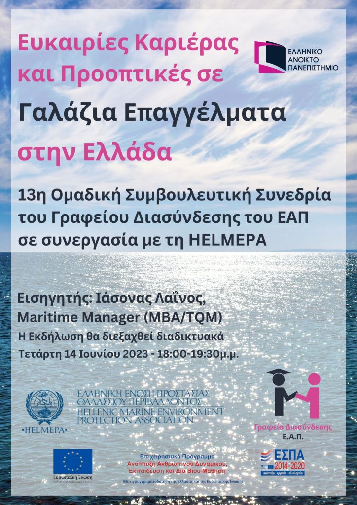 To Γραφείο Διασύνδεσης του ΕΑΠ σε συνεργασία με την Ελληνική Ένωση Προστασίας Θαλασσίου Περιβάλλοντος-HELMEPA, σας προσκαλεί στην 13η Ομαδική Συμβουλευτική Συνεδρία με θέμα :