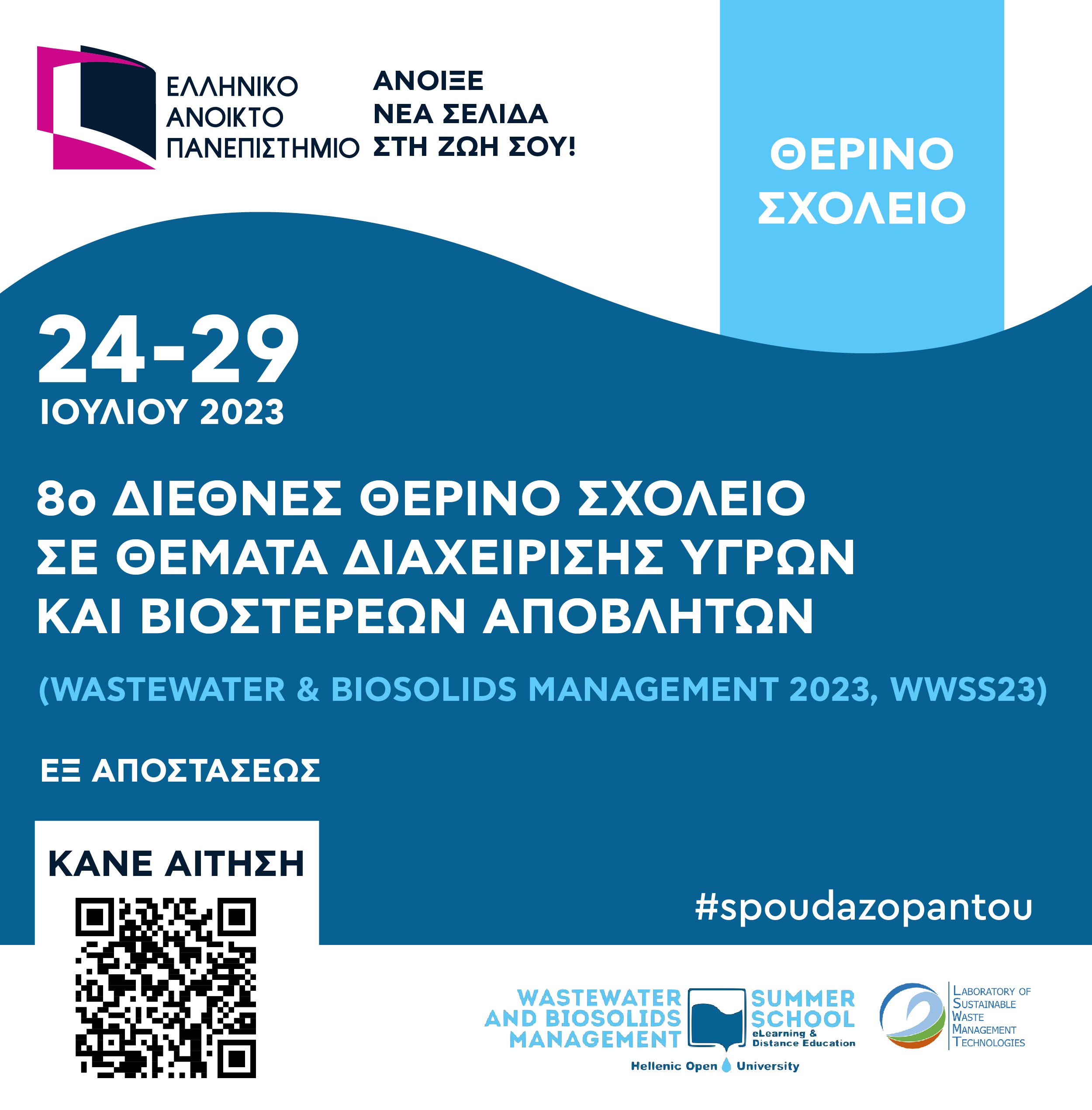 Το Εργαστήριο Τεχνολογιών Αειφορικής Διαχείρισης Αποβλήτων (ΕΤΑΔΑ) του Ελληνικού Ανοικτού Πανεπιστημίου με Επιστημονικό Υπεύθυνο τον Καθηγητή της ΣΘΕΤ/ΕΑΠ κ. Καλαβρουζιώτη Ιωάννη, διοργανώνει το 8ο Διεθνές e-learning Θερινό Σχολείο με θέμα “Διαχείριση Υγρών Αποβλήτων & Βιοστερεών (WWSS23).