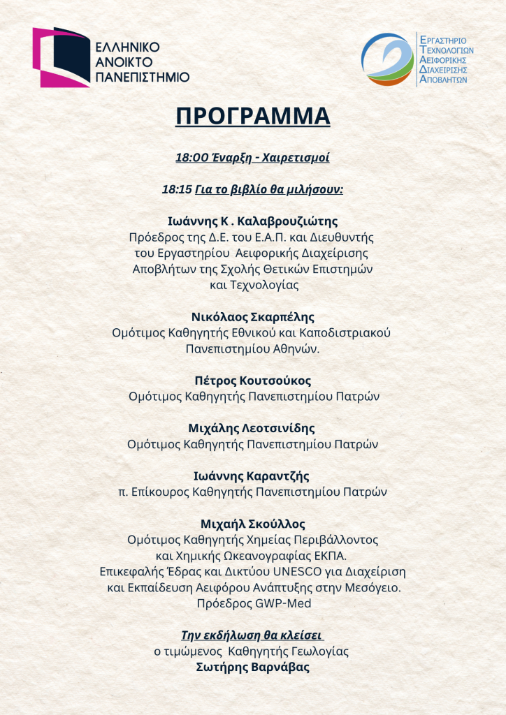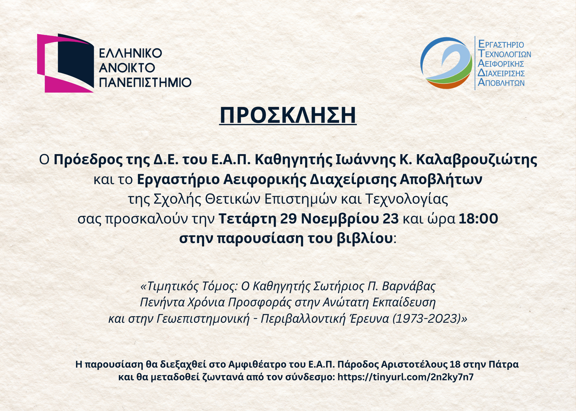 Το Εργαστήριο Τεχνολογιών Αειφορικής Διαχείρισης Αποβλήτων της Σχολής Θετικών Επιστημών και Τεχνολογίας του Ελληνικού Ανοικτού Πανεπιστημίου διοργανώνει στο Αμφιθέατρο του Ιδρύματος την Τετάρτη, 29 Νοεμβρίου και ώρα 18.00, εκδήλωση σχετικά με βιβλιοπαρουσίαση για τον Καθηγητή Σωτήριο Βαρνάβα, ο οποίος έχει διατελέσει Συντονιστής του Μεταπτυχιακού Προγράμματος Σπουδών «Διαχείριση Αποβλήτων» για πολλά ακαδημαϊκά έτη.