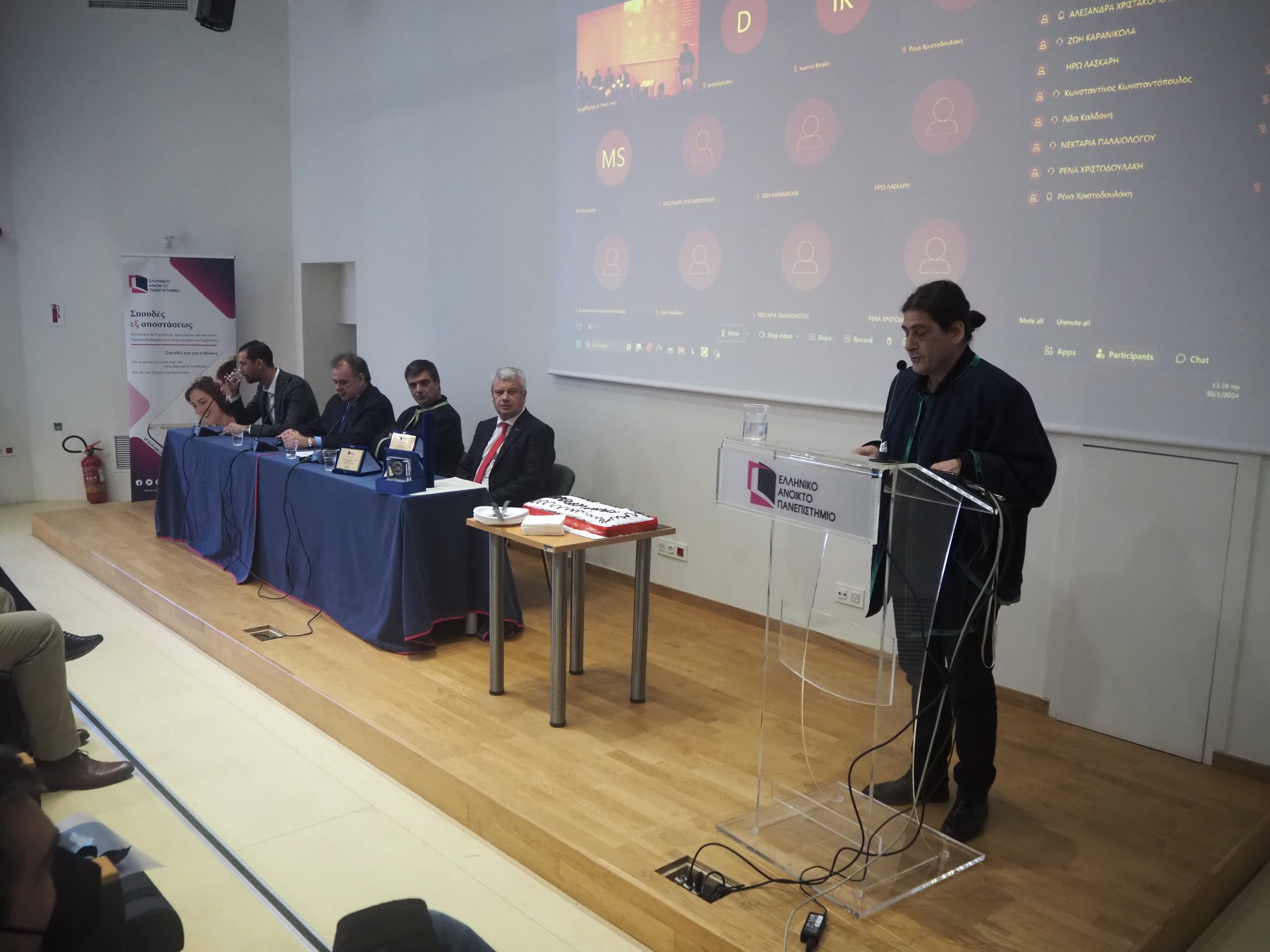 Η εκδήλωση ξεκίνησε με ομιλία του Προέδρου της Δ.Ε., Καθηγητή Ιωάννη Καλαβρουζιώτη, ο οποίος έκανε αναδρομή στην ιστορία του Ε.Α.Π. επισημαίνοντας ότι 28 χρόνια μετά την ίδρυσή του, δρομολογούνται οι διαδικασίες για την αυτονόμησή του, που σηματοδοτεί μια νέα αρχή, ένα νέο ξεκίνημα.