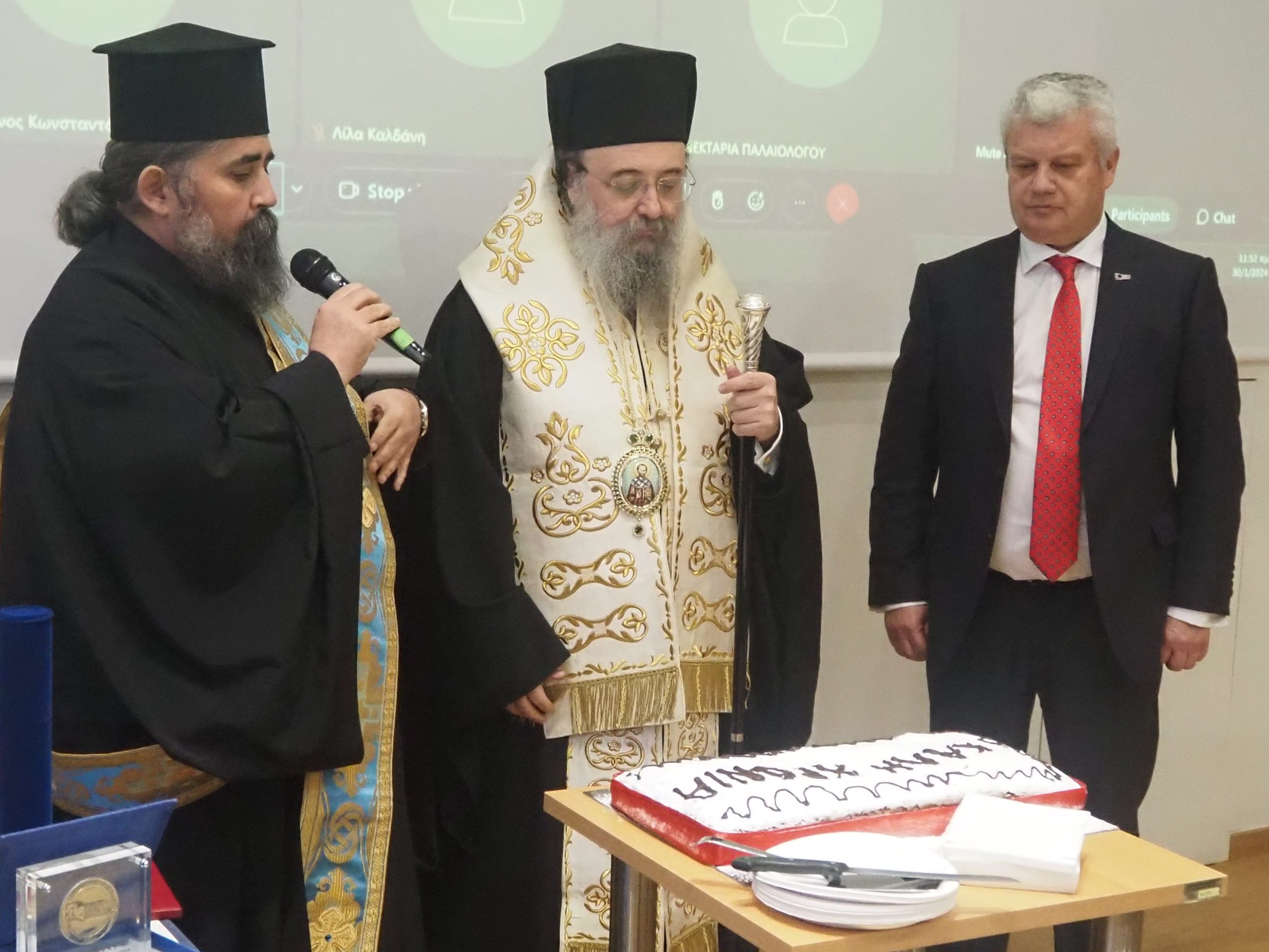 Τέλος ευχήθηκε σε όλους Καλή και Δημιουργική Νέα Χρονιά. Στο πλαίσιο του Εορτασμού των Τριών Ιεραρχών και της Ελληνικής Παιδείας, ο Επίκουρος Καθηγητής της Σχολής Ανθρωπιστικών Επιστημών, Στασινός Σταυριανέας, εκφώνησε τον Πανηγυρικό της Ημέρας με θέμα: «Η φιλοσοφία ως τέχνη του βίου στην ελληνική αρχαιότητα και σήμερα», ενώ ακολούθησε η αναγόρευση του μέλους ΔΕΠ της Σχολής Ανθρωπιστικών Επιστημών, Αργυρώς Λουκάκη, σε Ομότιμη Καθηγήτρια και  έγινε απόδοση τιμητικών πλακετών στα αφυπηρετήσαντα μέλη της ίδιας Σχολής, κκ. Κωνσταντίνο Αγόρα, Μαργαρίτα Δρίτσα, Αγγελική Πετροπούλου, στο μέλος ΔΕΠ της Σχολής Κοινωνικών Επιστημών και πρώην Υφυπουργό,  κ. Εύη Χριστοφιλοπούλου και στην οικογένεια της αείμνηστης Αναπληρώτριας Καθηγήτριας της Σχολής Θετικών Επιστημών και Τεχνολογίας, Φωτεινής Καριώτου.