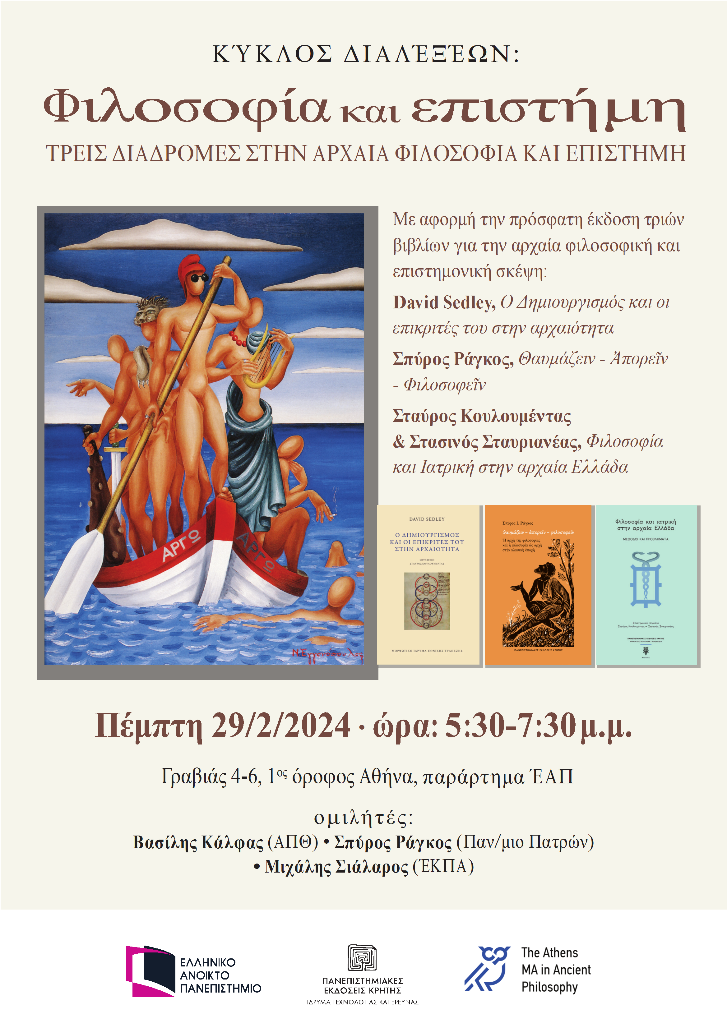 Στο πλαίσιο του κύκλου διαλέξεων «Φιλοσοφία και επιστήμη», η Σχολή Ανθρωπιστικών Επιστημών του Ελληνικού Ανοικτού Πανεπιστημίου σε συνεργασία με τις Πανεπιστημιακές Εκδόσεις Κρήτης και το “Athens MA in Ancient Philosophy” (ΕΚΠΑ) σας προσκαλούν στην εκδήλωση με τίτλο: