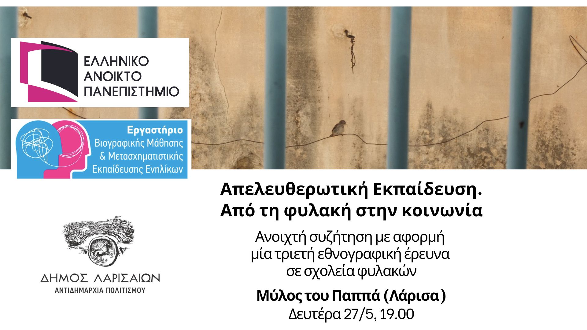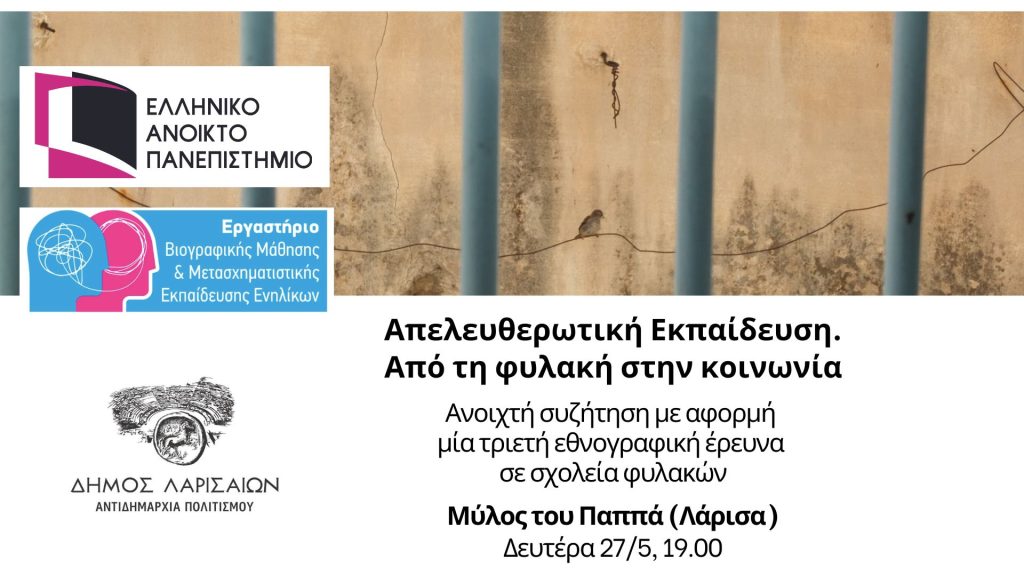 Το Ελληνικό Ανοικτό Πανεπιστήμιο διοργανώνει, σε συνεργασία με την Αντιδημαρχία Πολιτισμού του Δήμου Λαρισαίων, ανοιχτή εκδήλωση με τίτλο «Απελευθερωτική Εκπαίδευση. Από τη φυλακή στην κοινωνία», με αφορμή την ολοκλήρωση τριετούς εθνογραφικής έρευνας που διενεργήθηκε σε έξι διαφορετικά σχολεία ελληνικών φυλακών και υποστηρίχθηκε από το ΕΑΠ. Η εκδήλωση θα πραγματοποιηθεί στον Μύλο του Παππά, τη Δευτέρα 27 Μαΐου, στις 19.00.