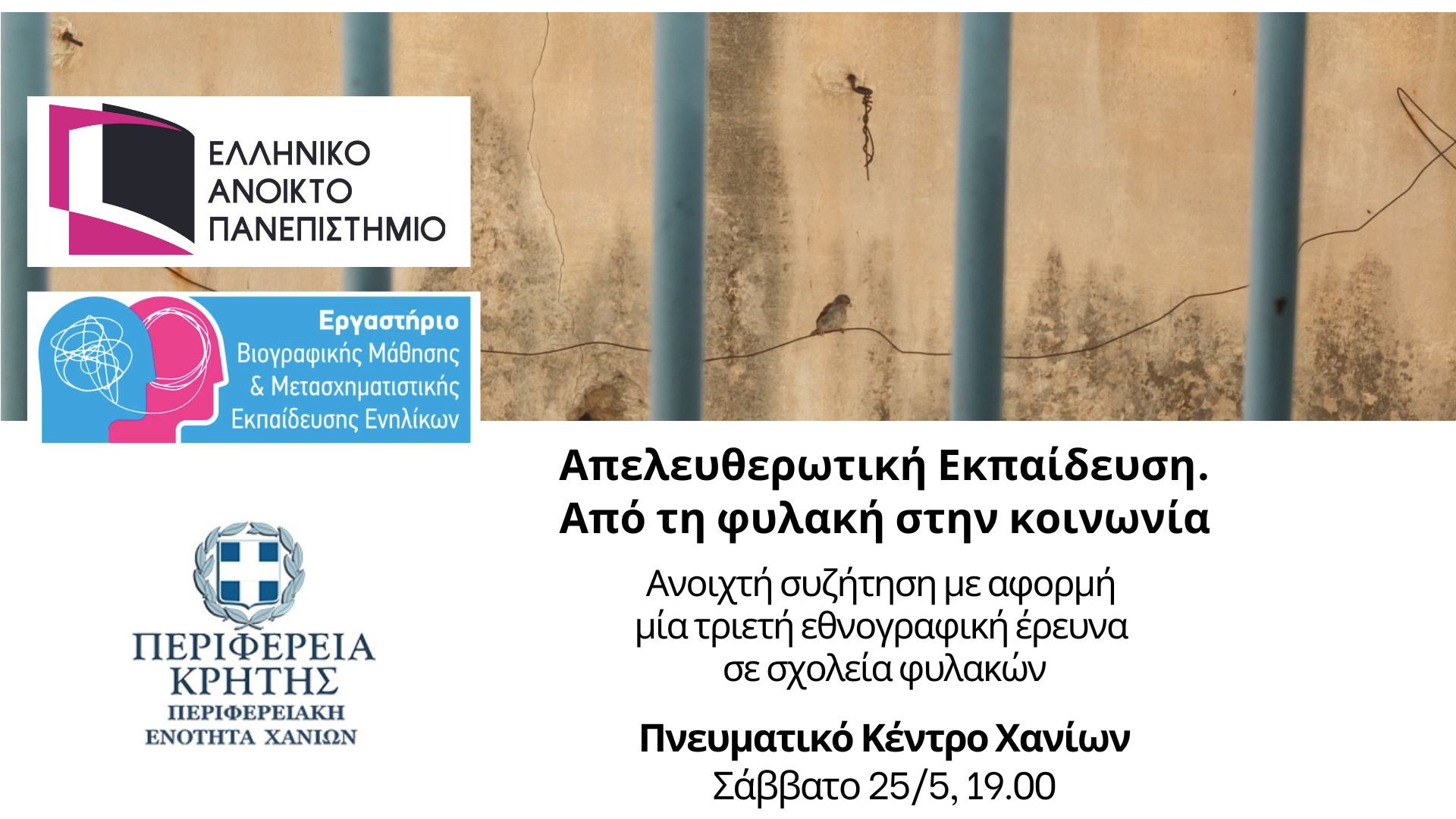 Το Ελληνικό Ανοικτό Πανεπιστήμιο και η Περιφέρεια Κρήτης – Περιφερειακή Ενότητα Χανίων συνδιοργανώνουν εκδήλωση με τίτλο «Απελευθερωτική Εκπαίδευση. Από τη φυλακή στην κοινωνία», με αφορμή την ολοκλήρωση τριετούς εθνογραφικής έρευνας που διενεργήθηκε σε έξι διαφορετικά σχολεία ελληνικών φυλακών και υποστηρίχθηκε από το ΕΑΠ. Η εκδήλωση θα πραγματοποιηθεί στο Πνευματικό Κέντρο Χανίων το Σάββατο 25 Μαΐου, στις 19.00.