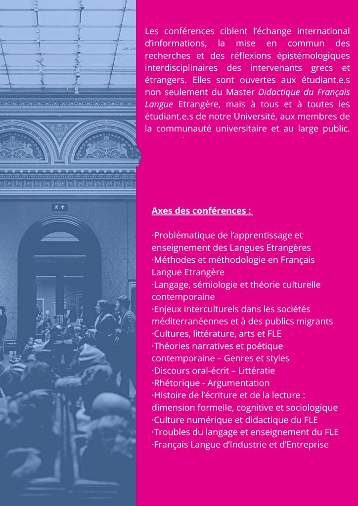 Οι διαλέξεις στοχεύουν στην ανταλλαγή ιδεών και στη διασύνδεση διεπιστημονικών ερευνών. Διεξάγονται στη γαλλική ή/και ελληνική γλώσσα διαδικτυακά μέσω της πλατφόρμας Webex και είναι ανοικτές στους φοιτητές όλων των Προπτυχιακών και Μεταπτυχιακών Προγραμμάτων Σπουδών του ΕΑΠ, όπως και σε όλα τα μέλη της ακαδημαϊκής κοινότητας και στο ευρύτερο κοινό.