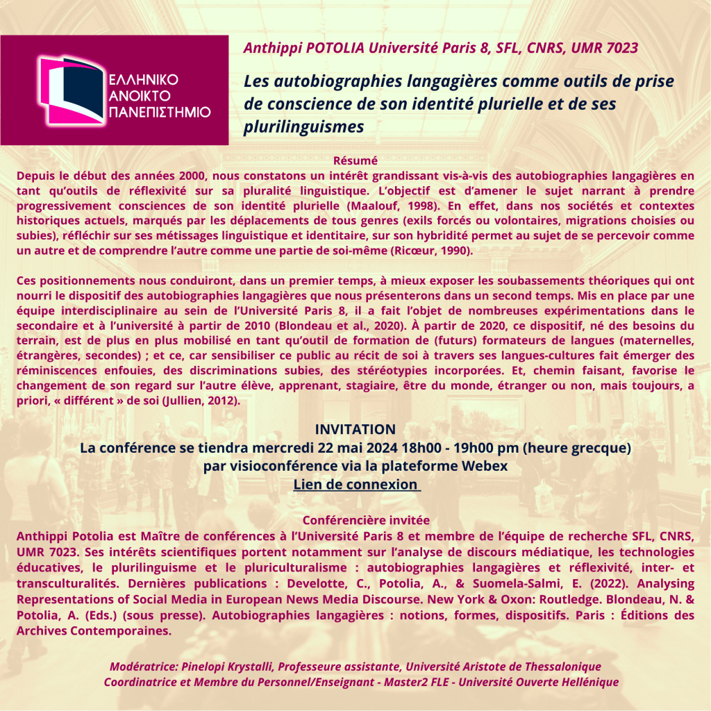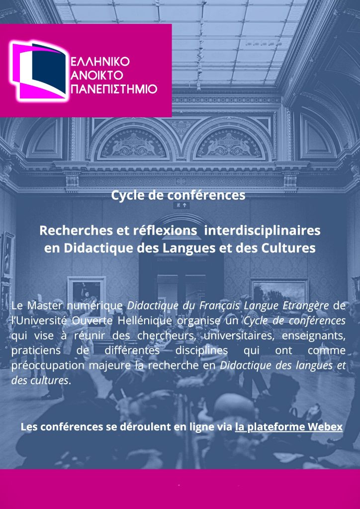 Το Μεταπτυχιακό Πρόγραμμα Σπουδών Διδακτική της Γαλλικής ως ξένης γλώσσας του Ελληνικού Ανοικτού Πανεπιστημίου συνεχίζει σταθερά για 3η συνεχή χρονιά τον Κύκλο διαλέξεων ξένων και ελλήνων διακεκριμένων ομιλητών εαρινού εξαμήνου που δραστηριοποιούνται στο πεδίο της διάδοσης και της διδασκαλίας Ξένων Γλωσσών και Πολιτισμών.
