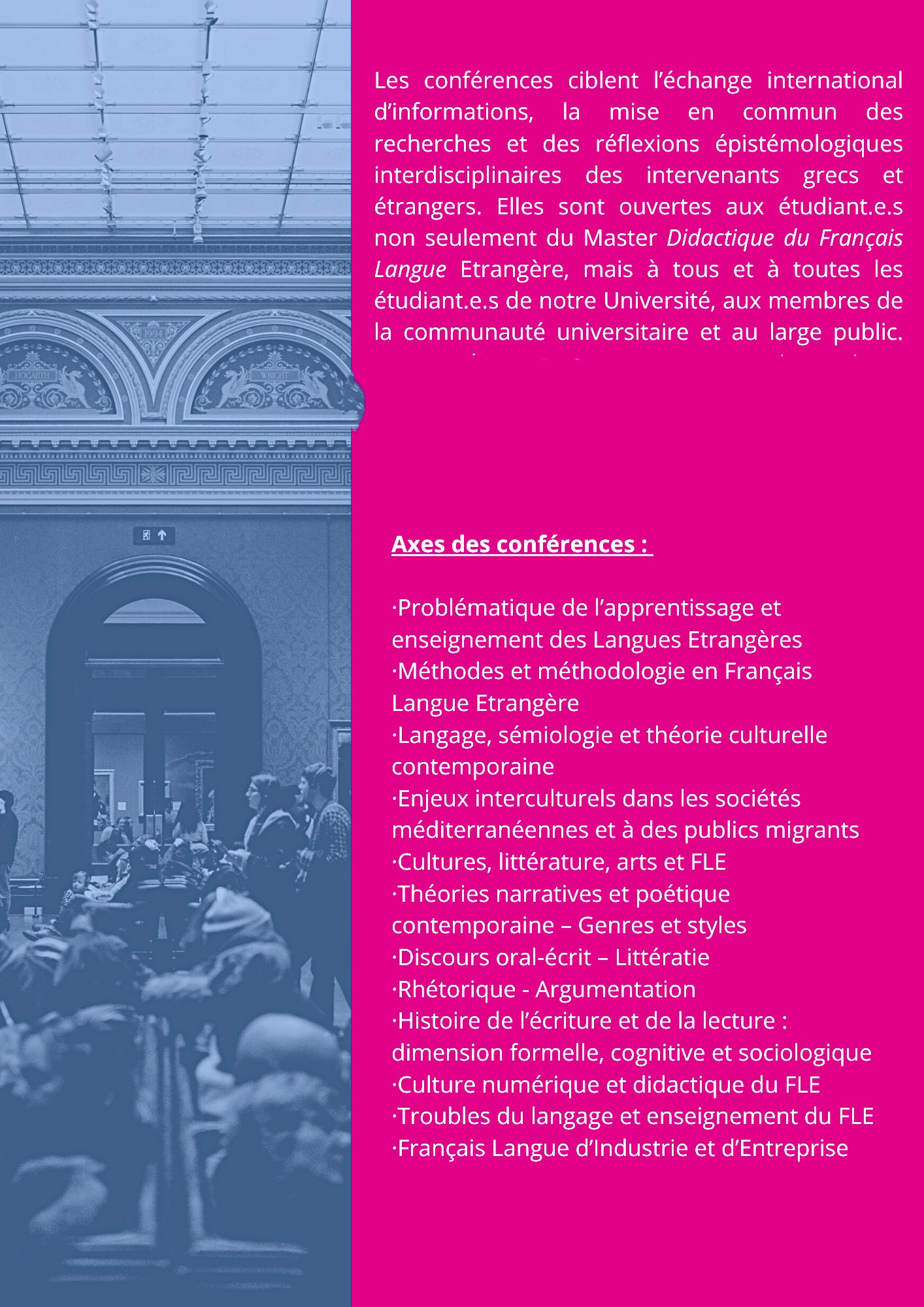 Το Μεταπτυχιακό Πρόγραμμα Σπουδών Διδακτική της Γαλλικής ως ξένης γλώσσας του Ελληνικού Ανοικτού Πανεπιστημίου συνεχίζει σταθερά για 3η συνεχή χρονιά τον Κύκλο διαλέξεων ξένων και ελλήνων διακεκριμένων ομιλητών εαρινού εξαμήνου που δραστηριοποιούνται στο πεδίο της διάδοσης και της διδασκαλίας Ξένων Γλωσσών και Πολιτισμών.
