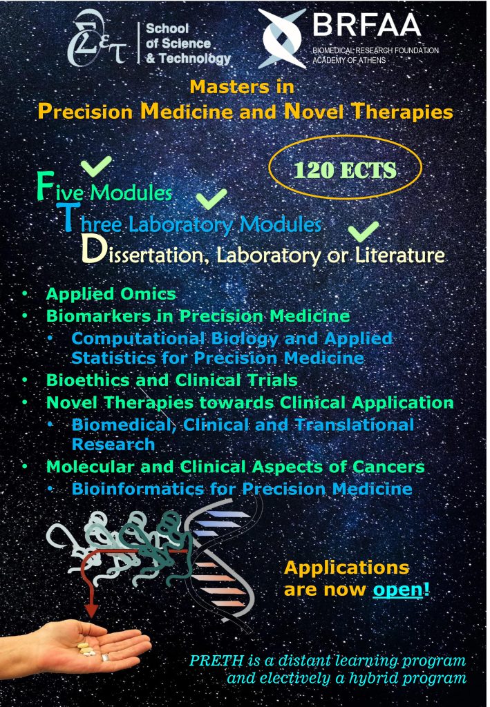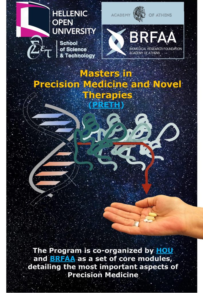 The Hellenic Open University (HOU) is pleased to announce a new, Inter-Institutional Master’s level degree program entitled “Precision Medicine and Novel Therapies”.  This Inter-Institutional program is undertaken by the Faculties of the School of Science and Technology of HOL and of the Biomedical Research Foundation of the Academy of Athens (BRFAA).  Both Institutions and Faculties welcome all potential students who wish to succeed in the novel and exciting field of Precision Medicine.