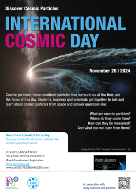 Για πρώτη φορά φέτος υπάρχει ελληνική συμμετοχή στην Διεθνή Ημέρα Κοσμικής Ακτινοβολίας! Το  Εργαστήριο Φυσικής του Ελληνικού Ανοικτού Πανεπιστημίου προσφέρει την ευκαιρία σε νέους και νέες από όλη την Ελλάδα να συμμετάσχουν στην εκδήλωση υποστηρίζοντας και καθοδηγώντας τους στο ταξίδι τους προς την γνώση των κοσμικών ακτινών! Μαθητές και εκπαιδευτικοί που συμμετέχουν στο δίκτυο Εκπαιδευτικών Τηλεσκοπίων Κοσμικής Ακτινοβολίας microNet (μNet) που συντονίζει με επιτυχία για 3η συνεχόμενη χρονιά το Εργαστήριο Φυσικής του ΕΑΠ, θα παρουσιάσουν σε νέους από όλες τις μεριές της Γης το ανιχνευτικό σύστημα μCosmics, τις εκπαιδευτικές δράσεις του προγράμματος που λαμβάνουν χώρα κάθε χρόνο καθώς και τα αποτελέσματα τους από την ανίχνευση της κοσμικής ακτινοβολίας!
