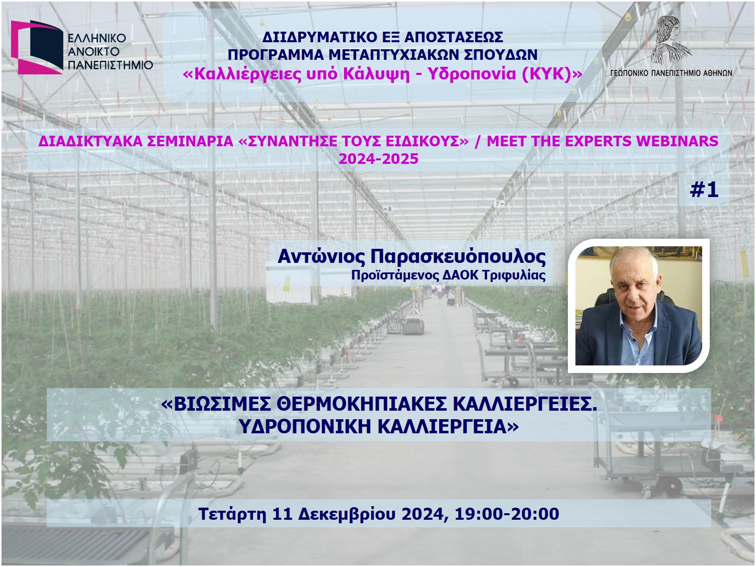 Πραγματοποιήθηκε την Τετάρτη 11 Δεκεμβρίου 2024, το πρώτο σεμινάριο της σειράς διαδικτυακών σεμιναρίων, με τίτλο: “Συνάντησε τους ειδικούς / Μeet the experts”, του Διιδρυματικού Προγράμματος Μεταπτυχιακών Σπουδών «Καλλιέργειες υπό Κάλυψη – Υδροπονία», (ΚΥΚ). Πρώτος καλεσμένος ήταν ο κύριος Αντώνιος Παρασκευόπουλος, προϊστάμενος ΔΑΟΚ Τριφυλίας, ο οποίος ανέπτυξε το θέμα: «Βιώσιμες θερμοκηπιακές καλλιέργειες – Υδροπονική καλλιέργεια». Στα σεμινάρια αυτά θα φιλοξενούνται ειδικοί σε θέματα καλλιεργειών υπό κάλυψη και υδροπονίας, από δημόσιους και ιδιωτικούς φορείς, της Ελλάδας και του εξωτερικού. Τα σεμινάρια απευθύνονται σε εν ενεργεία φοιτήτριες/ές, καθώς και σε αποφοίτους του προγράμματος ΚΥΚ.