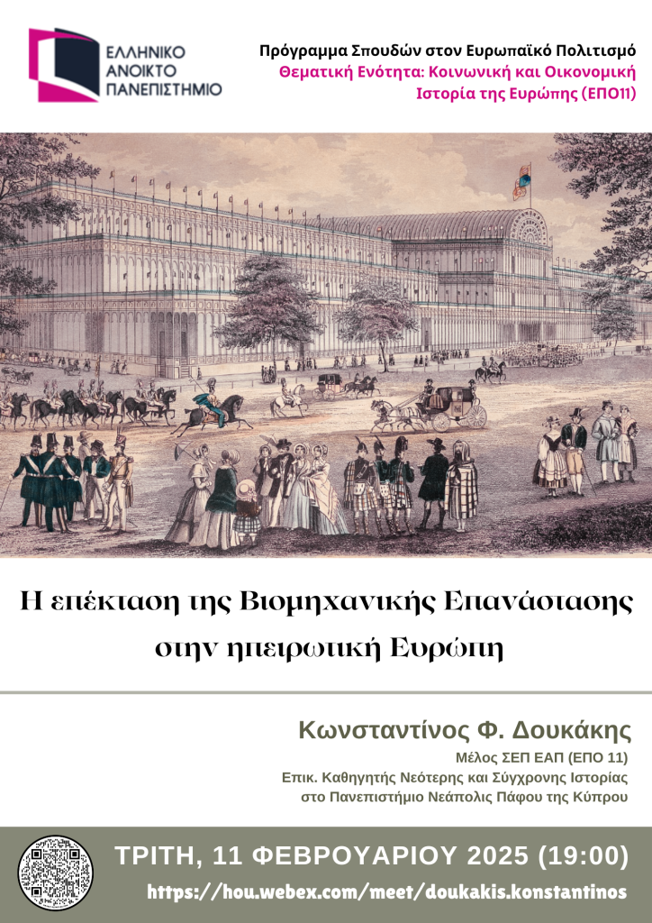 Η ΕΠΟ11 (Κοινωνική και Οικονομική Ιστορία της Ευρώπης) σας προσκαλεί στη διαδικτυακή διάλεξη του Δρ. Κωνσταντίνου Δουκάκη, μέλους ΣΕΠ του ΕΑΠ (ΕΠΟ11) και Επίκουρου Καθηγητή Νεότερης και Σύγχρονης Ιστορίας στο Πανεπιστήμιο Νεάπολις Πάφου της Κύπρου με θέμα: «Η επέκταση της Βιομηχανικής Επανάστασης στην ηπειρωτική Ευρώπη».