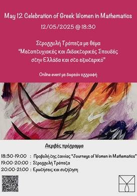 Η εσπερίδα είναι ένα από τα πολυάριθμα events που θα Εορτάζουν τις Γυναίκες στα Μαθηματικά (“Celebrating Women in Mathematics”) σε όλο τον κόσμο στις 12 Μαΐου: https://may12.womeninmaths.org