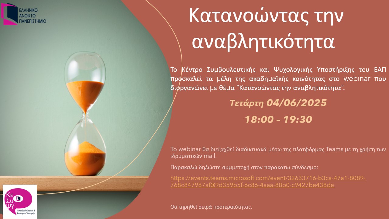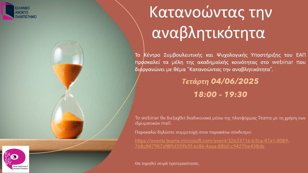 μετά το αυξημένο ενδιαφέρον για συμμετοχή με μεγάλη χαρά σας ανακοινώνουμε ότι το Κέντρο Συμβουλευτικής και Ψυχολογικής Υποστήριξης (ΚεΣυΨΥ) του Ελληνικού Ανοικτού Πανεπιστημίου επαναλαμβάνει τη διεξαγωγή του webinar με τίτλο “Κατανοώντας την αναβλητικότητα” το οποίο θα πραγματοποιηθεί την Τετάρτη 04/06/2025, από τις 18:00 μέχρι τις 19:30.