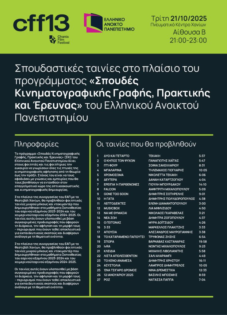 Το Φεστιβάλ Κινηματογράφου Χανίων, στο πλαίσιο της συνεργασίας του με το Ελληνικό Ανοικτό Πανεπιστήμιο (ΕΑΠ), φιλοξενεί φοιτητικές ταινίες και ντοκιμαντέρ που δημιουργήθηκαν στο Προπτυχιακό Πρόγραμμα «Σπουδές Κινηματογραφικής Γραφής, Πρακτικής και Έρευνας», καθώς και τα εργαστήρια των καθηγητών και ΣΕΠ της Σχολής Εφαρμοσμένων Τεχνών και Βιώσιμου Σχεδιασμού, Ηρώς Λάσκαρη και Ιάκωβου Παναγόπουλου.