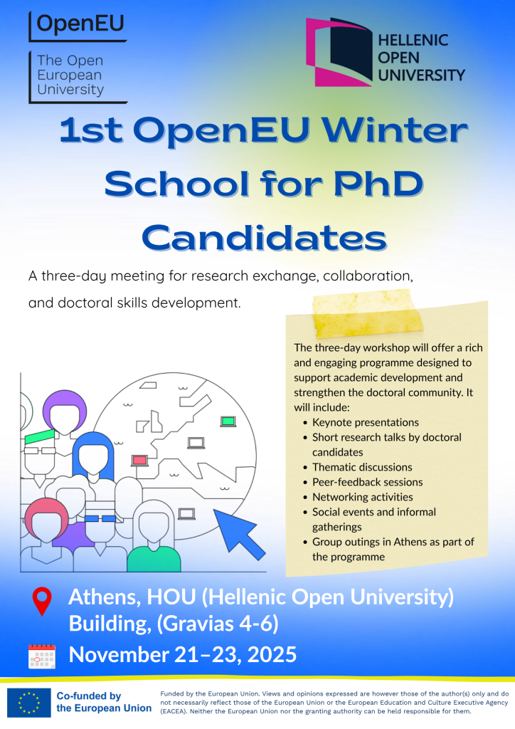 Το Ελληνικό Ανοικτό Πανεπιστήμιο ανακοινώνει τη διοργάνωση του 1ου International Winter School για υποψήφιους/ες διδάκτορες, στο πλαίσιο της Ευρωπαϊκής Συμμαχίας OpenEU.