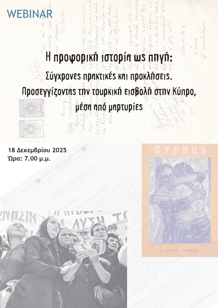 «Η Προφορική Ιστορία ως πηγή: Σύγχρονες πρακτικές και προκλήσεις. Προσεγγίζοντας την τουρκική εισβολή στην Κύπρο μέσα από μαρτυρίες» στις 18 Δεκεμβρίου 2025 και ώρα 19.00