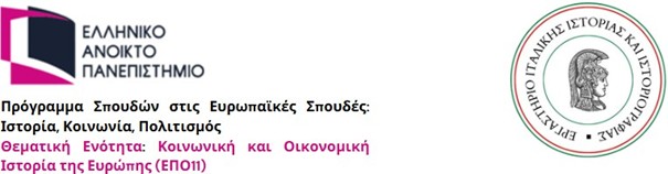 Το Πρόγραμμα Σπουδών στις Ευρωπαϊκές Σπουδές: Ιστορία, Κοινωνία, Πολιτισμός, Θεματική Ενότητα: Κοινωνική και Οικονομική Ιστορία της Ευρώπης – ΕΠΟ11 του Ελληνικού Ανοιχτού Πανεπιστημίου και το Εργαστήριο Ιταλικής Ιστορίας και Ιστοριογραφίας του Τμήματος Ιταλικής Γλώσσας και Φιλολογίας (ΕΚΠΑ) σας προσκαλούν στη σεμιναριακή διάλεξη του Καθ. Γεράσιμου Παγκράτη (Τμ. Ιταλικής Γλώσσας και Φιλολογίας ΕΚΠΑ, ΕΠΟ11 ΕΑΠ), με θέμα: