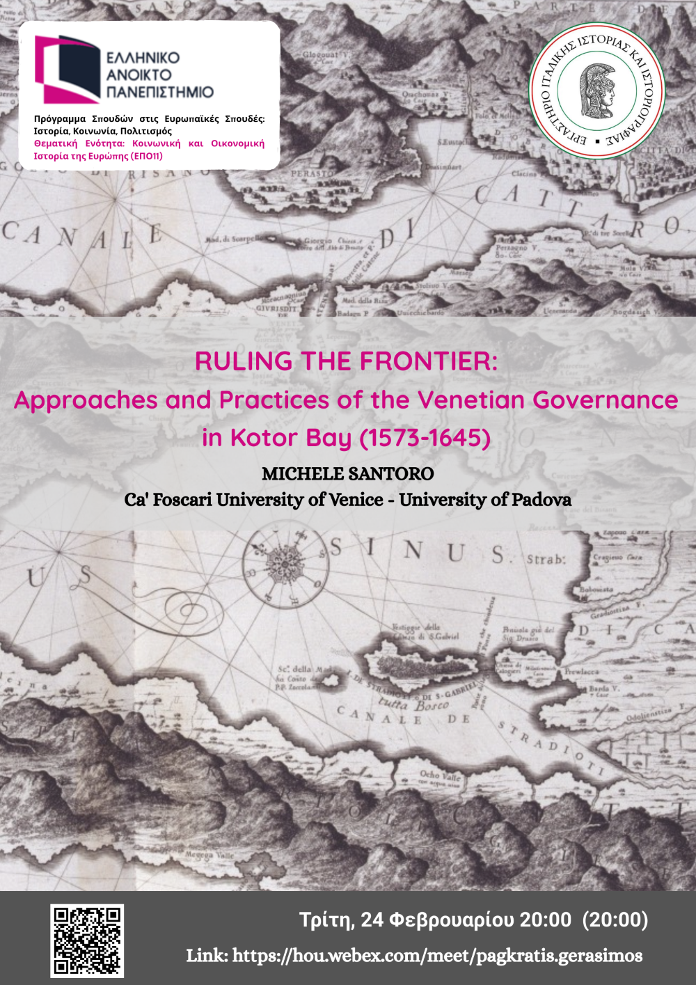 Το Πρόγραμμα Σπουδών στις Ευρωπαϊκές Σπουδές: Ιστορία, Κοινωνία, Πολιτισμός, Θεματική Ενότητα: Κοινωνική και Οικονομική Ιστορία της Ευρώπης – ΕΠΟ11 του Ελληνικού Ανοιχτού Πανεπιστημίου και το Εργαστήριο Ιταλικής Ιστορίας και Ιστοριογραφίας του Τμήματος Ιταλικής Γλώσσας και Φιλολογίας (ΕΚΠΑ) σας προσκαλούν στη σεμιναριακή διάλεξη του Δρ. Michele Santoro (PhD in Historical, Geographical and Anthropological Studies, Ca’ Foscari University – University of Padova), με θέμα: