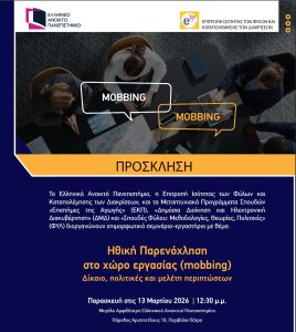 Το Ελληνικό Ανοικτό Πανεπιστήμιο (ΕΑΠ), η Επιτροπή Ισότητας των Φύλων και καταπολέμησης των Διακρίσεων (ΕΙΦΚΔ) και τα Μεταπτυχιακά Προγράμματα Σπουδών «Δημόσιας Διοίκησης και Ηλεκτρονικής Διακυβέρνησης» (ΔΜΔ), «Επιστημών της Αγωγής» (ΕΚΠ) και «Σπουδών Φύλου: Μεθοδολογίες, Θεωρίες, Πολιτικές» (ΦΥΛ), σας προσκαλούν την Παρασκευή 13 Μαρτίου 2026 και ώρα 12.30 μ.μ. στο Επιμορφωτικό Εργαστήριο με θέμα «Ηθική Παρενόχληση στο χώρο εργασίας (mobbing). Δίκαιο, πολιτικές και μελέτη περιπτώσεων» με υπεύθυνες εκπαίδευσης την Χριστίνα Μ. Ακριβοπούλου, Επίκουρη Καθηγήτρια Θεσμών και Πολιτικών Ανθρωπίνων Δικαιωμάτων ΕΑΠ, την Χριστίνα Δημολιού, Δρ. Δημοσίου Δικαίου και την Κατερίνα Παπαδοπούλου, Δρ. Δημοσίου Δικαίου.