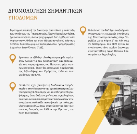 των υποδομών του Πανεπιστημίου. Έχουν δρομολογηθεί και σημαντικά τις κτιριακές υποδομές